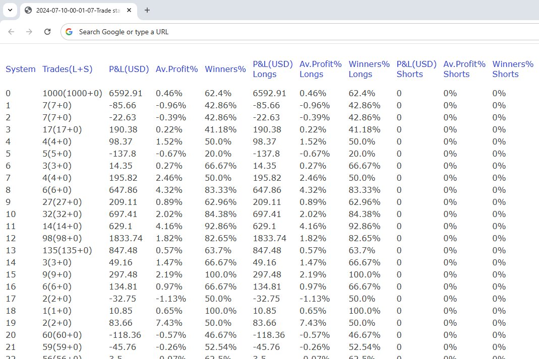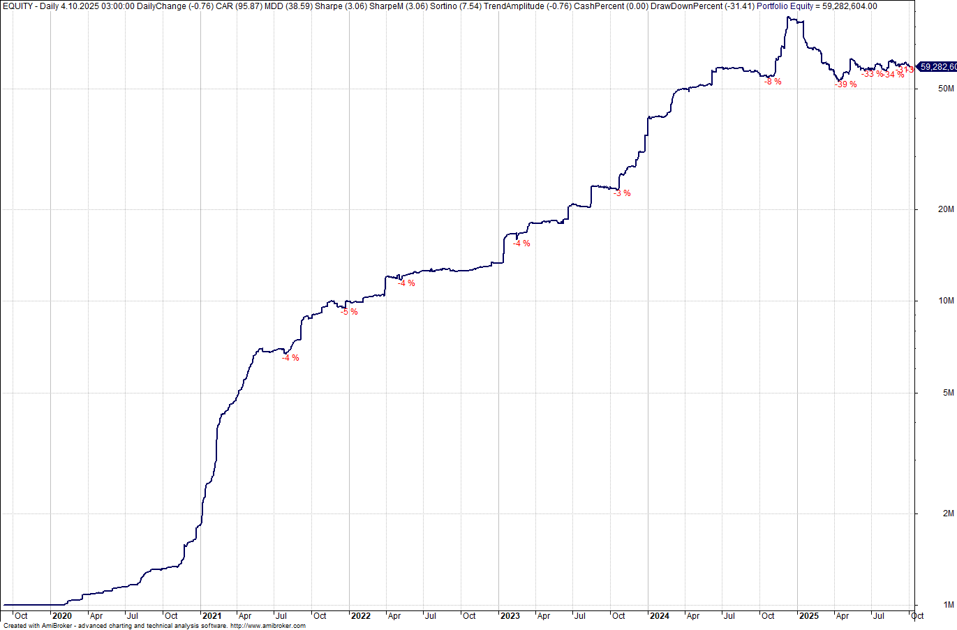 No trading system should ever go live without extensive backtesting. The equity curve below represents the combined outcome of dozens of independent models, each executed through AmiBroker’s portfolio-level testing environment and controlled programmatically via Python automation scripts. Using this setup, we were able to run multiple large-scale portfolio backtests in sequence — each covering all Binance Futures pairs — and then merge their equity results directly inside AmiBroker using Python integration.